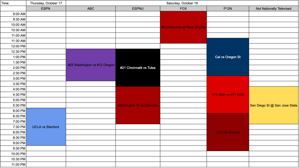 Below is the Week 8 Bruin Rooting Guide. We will rank the games in order of importance to Bruin fans – from least important to most important to game of the week. Our Bruins had a bye and we took a much needed bye this past weekend while our opponents played for something. We’re 1-2 in conference play, so until we’re officially eliminated from Pac-12 championship contention, I will have to suffer in making this rooting guide.